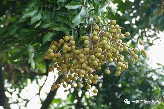 说到荔枝,不能不提它的一个兄弟,龙眼,虽说它们同科不同属,但是它们还真的好亲。龙眼的生长环境和荔枝几乎一样,有荔枝树的地方,往往也有龙眼树。荔枝成熟得早,等荔枝下市了,新鲜的龙眼正好可以吃了。所以,龙眼有“亚荔枝”、“荔枝奴”的别称。龙眼是无患子科龙眼属常绿乔木,原产于中国南部地区,分布于福建、台湾、海南、广东、广西、云南、贵州、四川等省区,主产于福建、台湾、广西。龙眼又叫桂圆,一般说来,新鲜的生果叫龙眼,晒干之后叫桂圆;但根据地域不同,叫法也不同,也有地区两者叫法并无区别。之所以会出现名字不同,有一种说法比较靠谱,据说在封建时代由于龙眼是犯忌,为了避讳就改个叫法,因为广西产的龙眼颗粒浑圆,质量上乘,于是取广西的别称桂,称之为桂圆。和荔枝性属湿热不同,龙眼能够入药,有壮阳益气、补益心脾、养血安神、润肤美容等多种功效,可治疗贫血、心悸、失眠、健忘、神经衰弱及病后、产后身体虚弱等症。荔枝和龙眼在结果的时候就很容易分了,可在非结果的时候,很多人会把它们混在一起,它们叶片的形态、花朵的外形都不一样。荔枝叶片呈椭圆披针形,奇数羽状复叶,聚伞花序颜色黄绿,龙眼叶片呈长圆披针形,圆锥花序,颜色黄白。▼龙眼 Dimocarpus longan Lour.无患子科 Sapindaceae 龙眼属