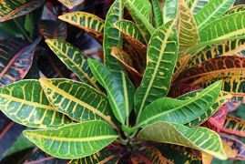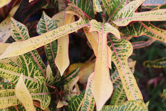 变叶木(Codiaeum variegatum )为大戟科(Euphorbiaceae)变叶木属植物,是自然界中颜色和形状变化最多的观叶植物,若用“赤橙黄绿青蓝紫”来形容一种植物,那非变叶木莫属了,犹如在锦缎上洒满了金点,又好似在宣纸上随意泼洒了彩墨,因而变叶木也有“洒金榕”之美誉。